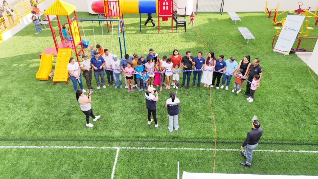 La obra, que contempla una inversión de USD. 44.500 e intervención de 465 m², incluyó renovación completa de césped, la instalación de juegos infantiles, cerramiento perimetral, pintura y la colocación de bancas, generando así un espacio renovado y seguro para la recreación social.